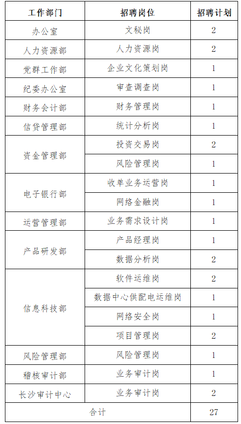 面向社会公开招聘省农信联社机关(含长沙审计中心)工作人员27人。招聘岗位及招聘计划数见下表: